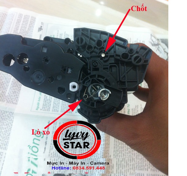 Sau khi đổ mực xong chúng ta đưa hộp mực vào máy đúng vị trí ban đầu, bật máy lên nếu máy kêu cạch cạch thì có nghĩa là bạn đã lắp sai vị trí của lò so tiếp xúc với drum, hoặc mất. Nên kiểm tra lại !