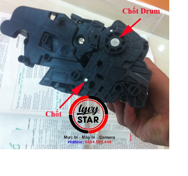 Sau khi rút chốt 2 bên như hình thì mình vệ sinh bê khoan mực thải và đổ mực chính vào ..Hộp mực 76A nên thay trống drum để có độ đậm đẹp hơn..Bản in sắc nét hơn..