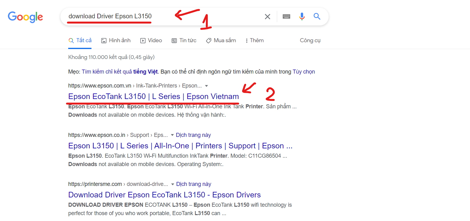 Sau khi đã chuẩn bị xong những thứ trên, bạn truy cập vào website Google.com.vn nhập vào dòng download Driver Epson L3150 và click chọn vào ngay link đầu tiên.
