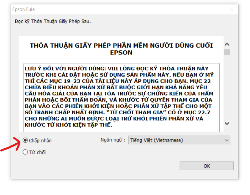 Bảng cửa sồ mới xuất hiện lên, bạn tích chọn vào ô Agree (Đồng ý) sau đó chọn OK. Vậy là đã xong, chỉ cần chờ máy tự cài đặt là bạn có thể in rồi nhé.