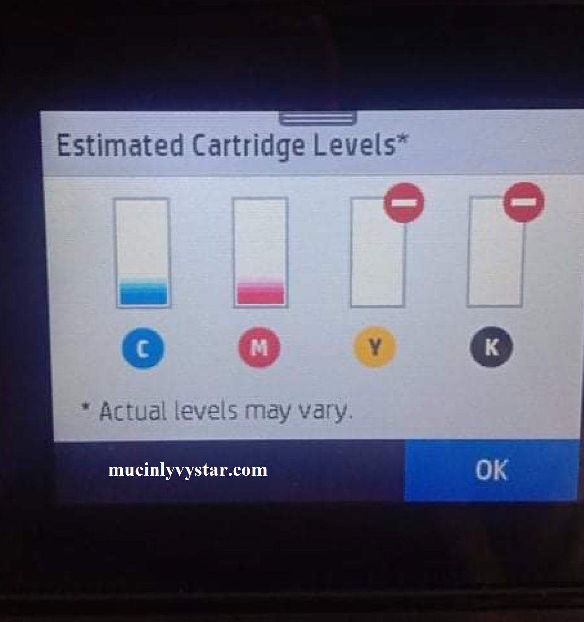 Sau khi bạn sử dụng máy in HP OfficeJet Pro 7740 thời gian dài, khi in máy sẽ xuất hiện tình trạng báo lỗi hết mực trên màn hình và không cho bạn in (như ảnh bên dưới màu đen và vàng đã hết mực).